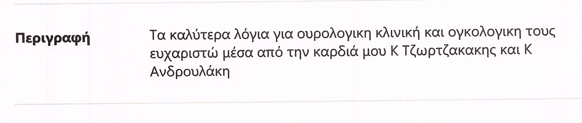 ΕΥΧΑΡΙΣΤΗΡΙΟ ΓΙΑ ΟΥΡΟΛΟΓΙΚΗ ΚΑΙ ΟΓΚΟΛΟΓΙΚΗ ΚΛΙΝΙΚΗ ΚΑΙ ΙΑΤΡΟΥΣ κκ. ΤΖΩΡΤΖΑΚΑΚΗ ΚΑΙ ΑΝΔΡΟΥΛΑΚΗ