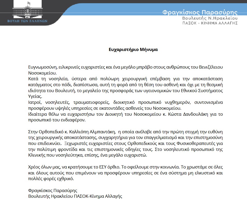 ΕΥΧΑΡΙΣΤΗΡΙΟ ΓΙΑ ΤΗΝ ΟΡΘΟΠΕΔΙΚΗ ΚΛΙΝΙΚΗ , ΤΟ ΤΜΗΜΑ ΦΥΣΙΚΟΘΕΡΑΠΕΙΑΣ,ΚΑΙ ΤΟ ΠΡΟΣΩΠΙΚΟ ΤΟΥΣ, ΑΠΟ ΤΟ ΒΟΥΛΕΥΤΗ ΠΑΡΑΣΥΡΗ ΦΡΑΓΚΙΣΚΟ